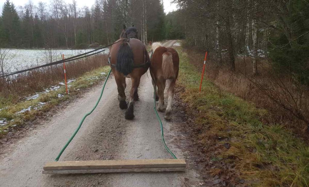 Han har även fått bekanta sig med slangsläpan. Han har fått träna på beröring mot benen med slangarna och att bli kliad av dom. Idag tömkörde vi Jonna med Alfavill vid sidan samtidigt som Jonna drog slangsläpan. Slangsläpan är det det första av dom olika delmoment som han ska få jobba med under sin utbildning. Den väsnas en hel del och det kändes därför som ett ypperligt tillfälle att vänja honom vi det oväsnet redan nu även om han inte ens har kommit till tömkörningen ännu. Vid sidan av mamma Jonna så är han trygg och introducerars på bästa vis för nya saker. Guld värt. Nu är tanken att vi ska dra i handbromsen och fortsätta att repetera alla olika vardagsituationer med honom som han redan fått en liten försmak på. I morgon så ska han börja att gå en stund i en hage utan sin mamma tillsammans med Millie som stöd. Vi tänkte påbörja avvänjning långsamt sakta men säkert nu.